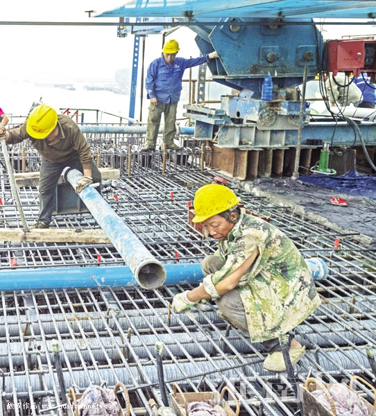 图十:淮河特大桥的建桥工人正在进行施工。