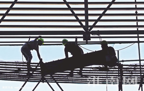 图七:工人在市重点项目工地进行安装作业。