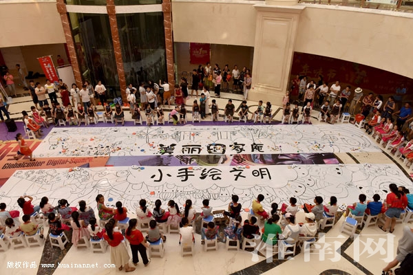 日前,田家庵区举办了“美丽田家庵·小手绘文明”青少年书法绘画作品展活动,孩子们用五彩画笔描绘自己心中的文明城市。图为活动现场百名少年儿童在巨幅画布上共同作画。