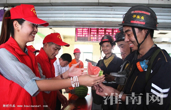 为全面做好夏季防暑降温工作,中煤新集公司刘庄煤矿早安排、早部署,提前采购防暑降温物品,该矿党政班子深入一线将把西瓜、毛巾、肥皂、矿泉水、牛奶等慰问品送到职工手中。为高温下坚守在岗的职工,送去了一份清凉、一份关怀。图为中煤新集公司刘庄煤矿青年志愿者为刚刚升井的职工送上新鲜的西瓜。 (通讯员 杨同鸟 王寅 编辑 汤宁)