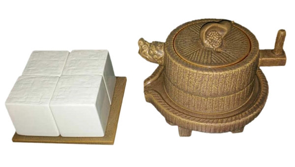 淮河早报、淮南网记者看到,这套茶具集个性、仿真、复古于一身,以寿州窑陶质原料制作石磨茶壶、磨盘及木架,以高温白瓷材料制作豆腐形态的茶杯,造型自然古朴,纹路细腻清晰,的确别具一格。“这是将传统与现代工艺相结合,手工刻画而成。”朱兆龙说,“壶嘴设计为一鳌头,寓意‘独占鳌头’之美意!”