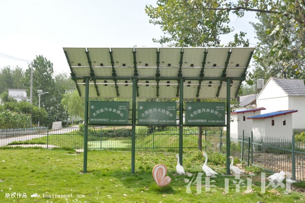 近日,记者在凤台县朱马店镇太庙村中心村采访,被太阳能微动力生活污水处理设施所吸引。据悉,这套污水处理系统总投资48万元,地上有太阳能光伏电池板等设备,地下由微曝气成套一体设备等组成,利用太阳能提供动力,每天可处理污水达150吨,对村民生活污水收集达90%以上,有效解决了全村3000多村民生活污水排放问题。(通讯员 童云山 记者 朱庆磊 编辑 汤宁)