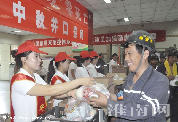 9月24日,中煤新集口孜东矿组织女工协安员,为出入井的职工发放月饼、苹果、牛奶,向在中秋佳节坚守一线的职工送去节日祝福。活动中,女工协安员不时提醒入井的职工遵章守纪、按章作业,高高兴兴入井,平平安安下班,让中秋佳节安全、平安、甜蜜。图为女工协安员在该矿井口等候室为出入井的职工发放节日礼包。(通讯员 陈正飞 刘家福 编辑 汤宁)
