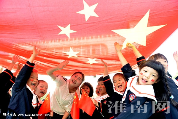 9月29日,安徽淮南市直机关幼儿园的小朋友与国旗合影,庆祝新中国成立69周年。(特约摄影 孙振 陈彬 编辑 汤宁)