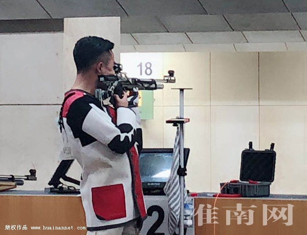 在刚刚结束的安徽省第十四届运动会射击比赛中,淮南小将朱旭沉着举枪、冷静应战,以620.1分的总成绩夺得男子甲组十米气步枪冠军,为淮南代表队再夺一枚金牌。图为朱旭在赛场上举枪射击。(记者 陈崇韧 编辑 汤宁)