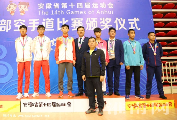 图:方啸(后排右5)带领淮南空手道队在省运会上斩金夺银(记者 苏国义 编辑 汤宁)