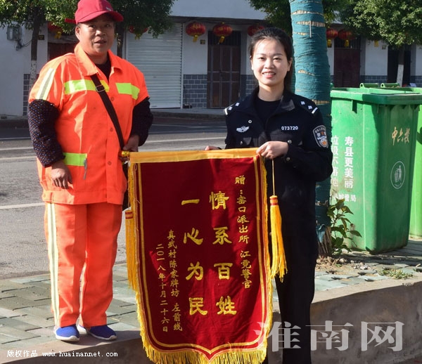 10月30日上午,寿县公安局窑口派出所将一幅“一心为民,情系百姓”的锦旗挂在光荣墙上,而送这面锦旗的是一名56岁的环卫工人,她有一肚子感谢的话要对民警说。