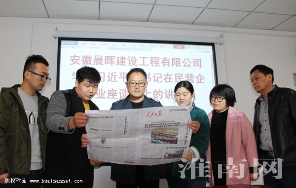 连日来,凤台县民营企业结合实际学习习近平总书记在民营企业座谈会上的讲话精神,并畅谈体会,进一步坚定抢抓机遇、加快发展的信心和决心。图为该县安徽晨晖建设工程有限公司组织员工学习习近平总书记有关民营企业发展讲话精神。 (记者 刘银昌 通讯员 常开胜 李娟 编辑 汤宁)