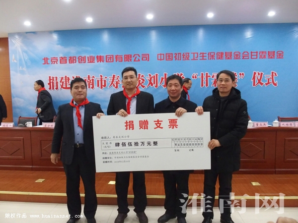 12月10日,北京首都创业集团、中国初级卫生保健基金会甘霖基金捐建淮南市寿县炎刘小学“甘霖楼”仪式在寿县新桥国际产业园举行,捐资450万元,援建炎刘小学一栋综合楼,并配备所需的现代化教学设备,以帮助寿县地区改善基本办学条件,缓解学校的办学压力,同时让更多的孩子接受到公平、有质量的基础教育,促进城乡义务教育均等化。