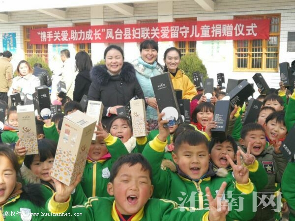 1月18日,充满自信的留守儿童高兴地举起受捐的学习和生活用品。当日,凤台县有关单位联合开展的“携手关爱,助力成长”关爱留守儿童捐赠活动在尚塘镇龙庙小学举行,500多名留守儿童分别领到保温杯、成语词典等用品,得到实实在在的关爱。图为捐赠现场。 (记者 刘银昌 通讯员 刘长明 编辑 汤宁)