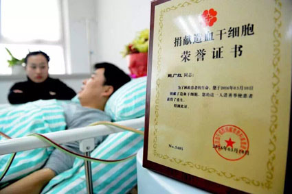 我们真是有缘,这是个有爱心有责任的好孩子,我一定要救她。”采集时,鲍广红得知这个女孩是在去年的一次献血时,偶然发现患上白血病的,女孩得到了及时治疗,治疗期间,经过在中华骨髓库里检索配型,很快就十分幸运地和鲍广红配型成功。女孩既兴奋又担心,怕捐献者到最后会不肯捐献。没想到,鲍广红斩钉截铁义无反顾地坚定捐献,这给女孩重燃了生命的希望。